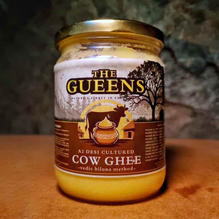 - At “The Gueens” we prepare A2 Desi Cow Ghee using the traditional Vedic Bilona method, where fresh A2 milk from native Indian cows is transformed into rich, aromatic ghee through a slow and authentic process.